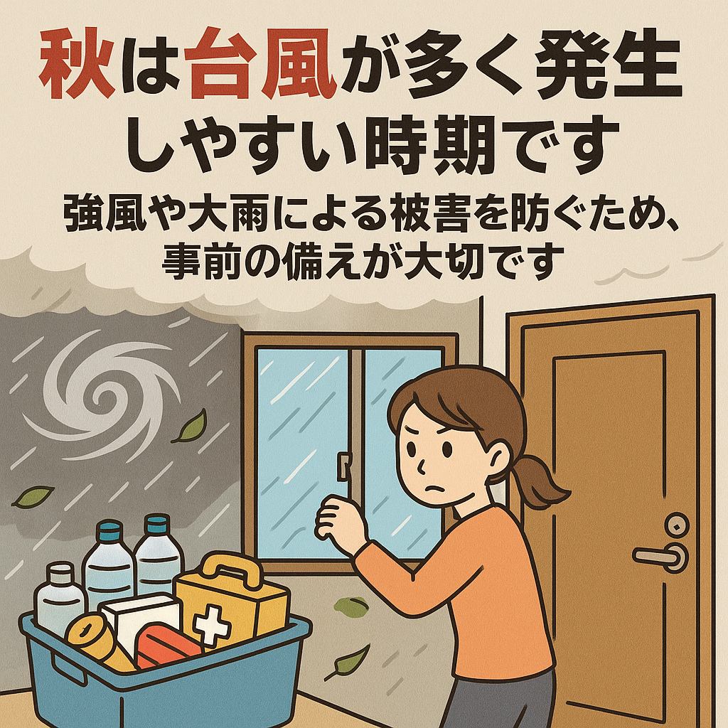 秋は台風が多く発生しやすい時期です。強風や大雨による被害を防ぐため、事前の備えが大切です。窓やドアの施錠、飛散物の片付け、非常用品の準備を忘れずに行いましょう。最新の気象情報にも注意し、安全確保に努めてください。