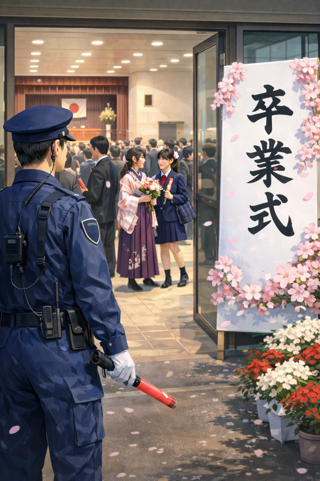 卒業式の季節を迎え、門出を祝う一方で、多くの人が集まる場所では安全確保が欠かせません。当社は警備のプロとして、皆さまの大切な節目を安心して迎えられるよう、しっかりと見守りサポートいたします。新たな旅立ちに心からエールを送ります。